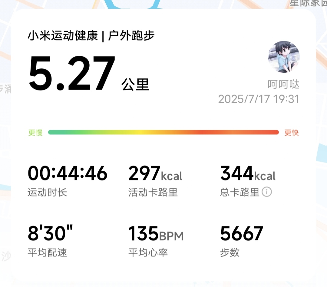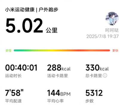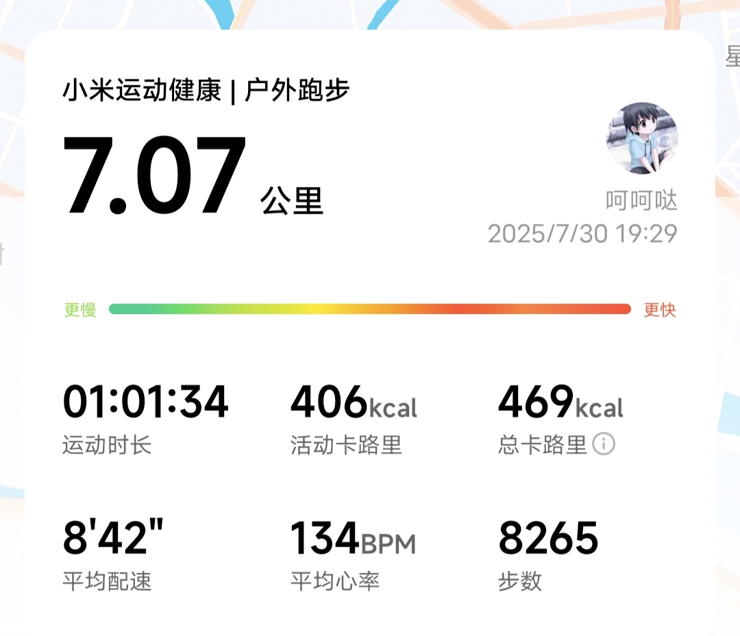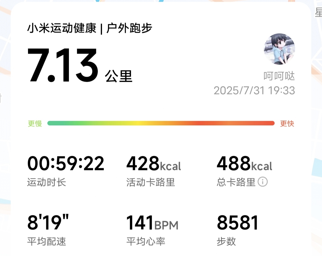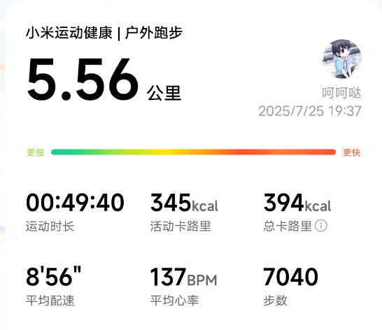 2025/07/25连续下了2场雨 暂停了2天 今天再次跑起感觉状态又提升了一点 心率能控制得低一点了.